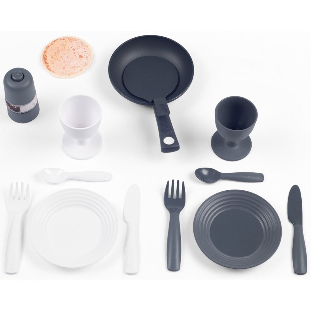 - Sunt incluse 13 accesorii: 2 farfurii, 2 furculite, 2 cutite, 2 furculite, 2 linguri, 2 pahare, 1 tigaie, 1 tigaie pentru clatite, 1 rasnita de sare si piper