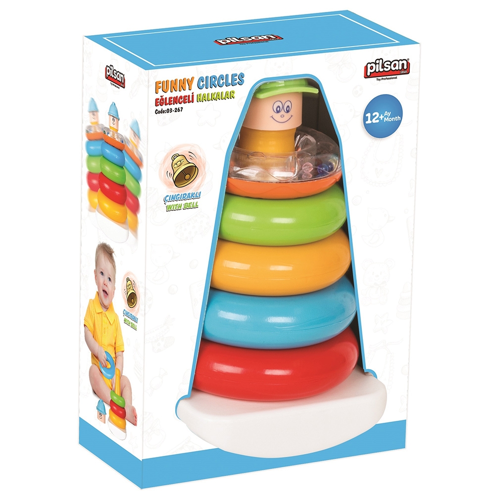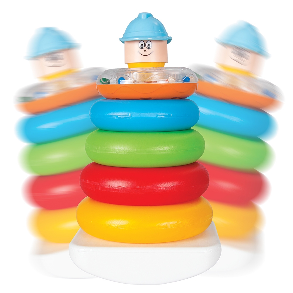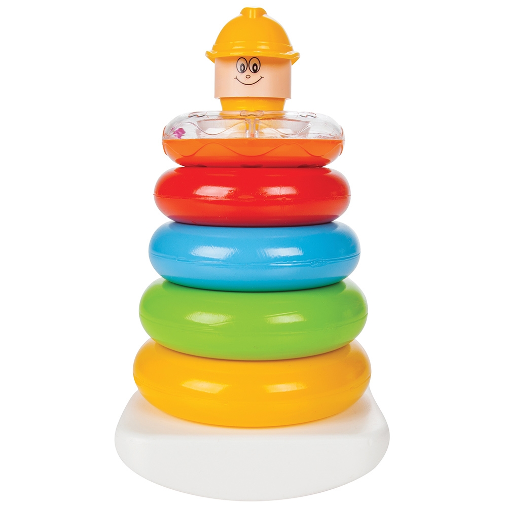 - Bebelusul tau poate apuca si scutura cele 5 inele colorate, de dimensiuni mari, apoi sa le ridice in sus si sa le potriveasca in baza