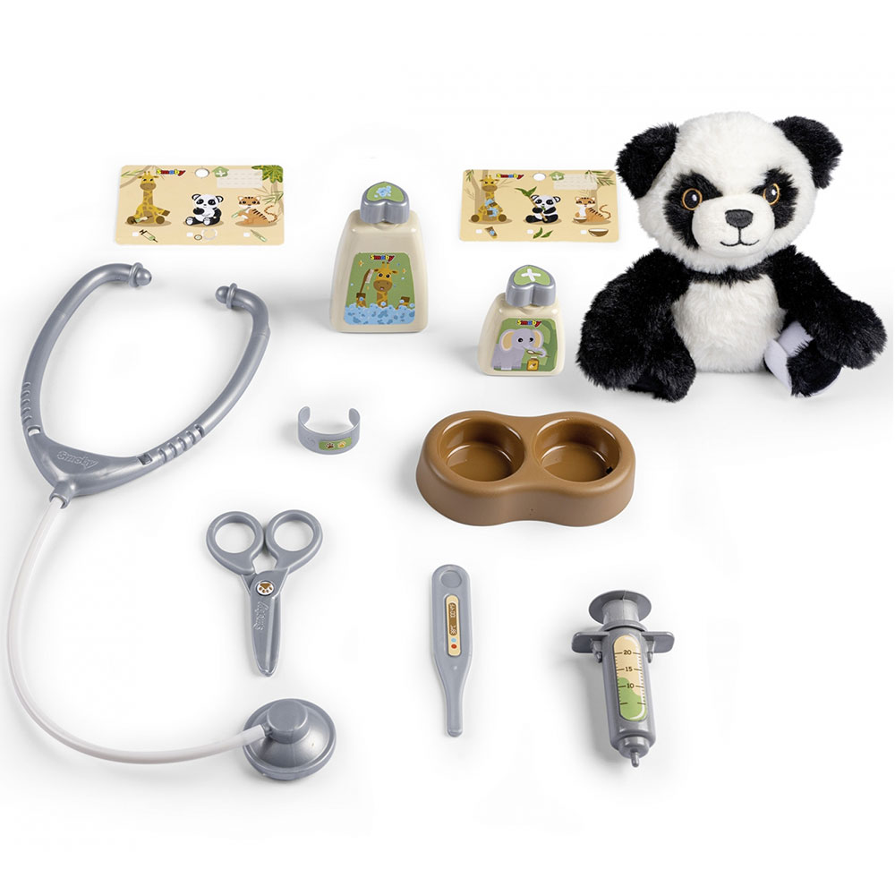 - Numeroasele accesorii incluse iti vor permite sa ai grija de panda ta de la inceput: 1 bol, 1 seringa, 1 termometru, 1 bratara, 1 bandaj, 1 foarfeca, 2 biberoane si 1 stetoscop