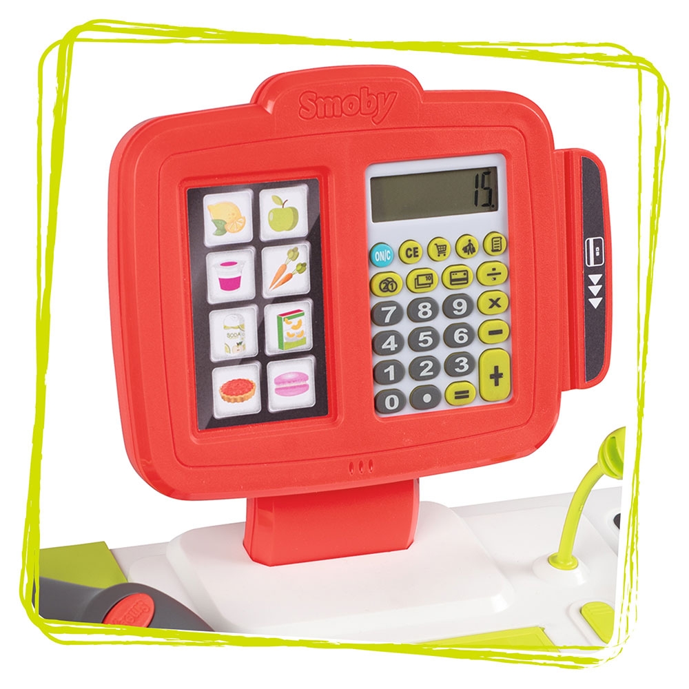 - Setul include: magazin mare cu mai multe locuri de joaca: casa de marcat, mini-standuri, frigider, colt de fructe / legume, cantar, casa de marcat electronica cu display LCD integrat, sertar pentru bani, scaner cu sunete si lumini, ceas si panou de informatii (deschis / inchis), cantar, frigider, microfon (decorativ, fara functii), terminal card de credit cu chitante, cos de cumparaturi, monede si bancnote, card de credit, 4 chitante, paine, legume si fructe, produselor alimentare