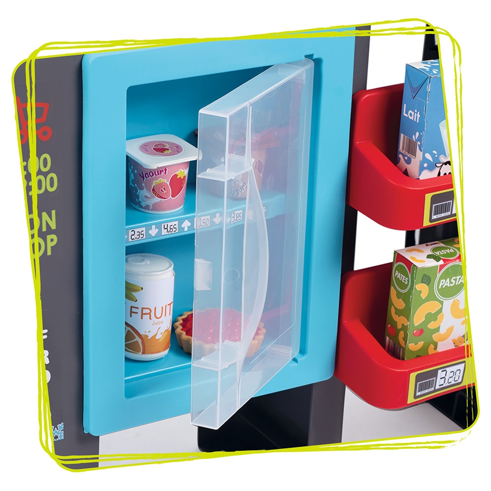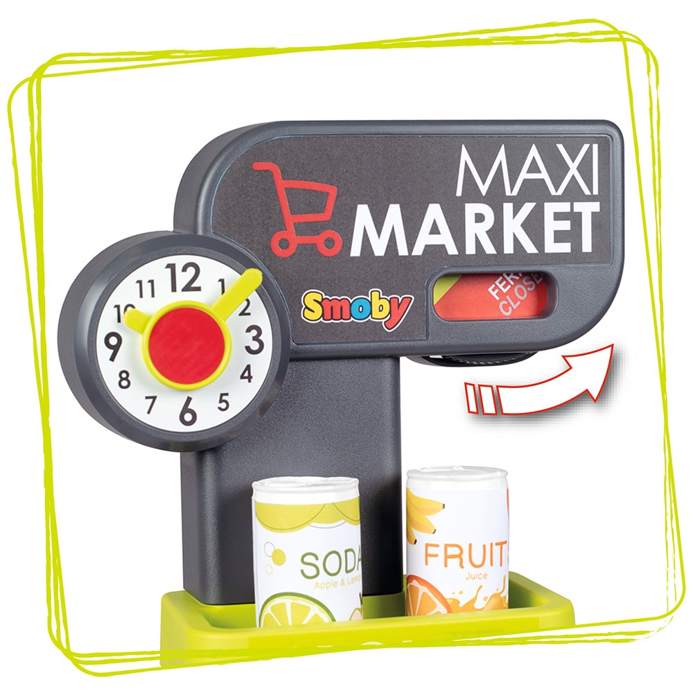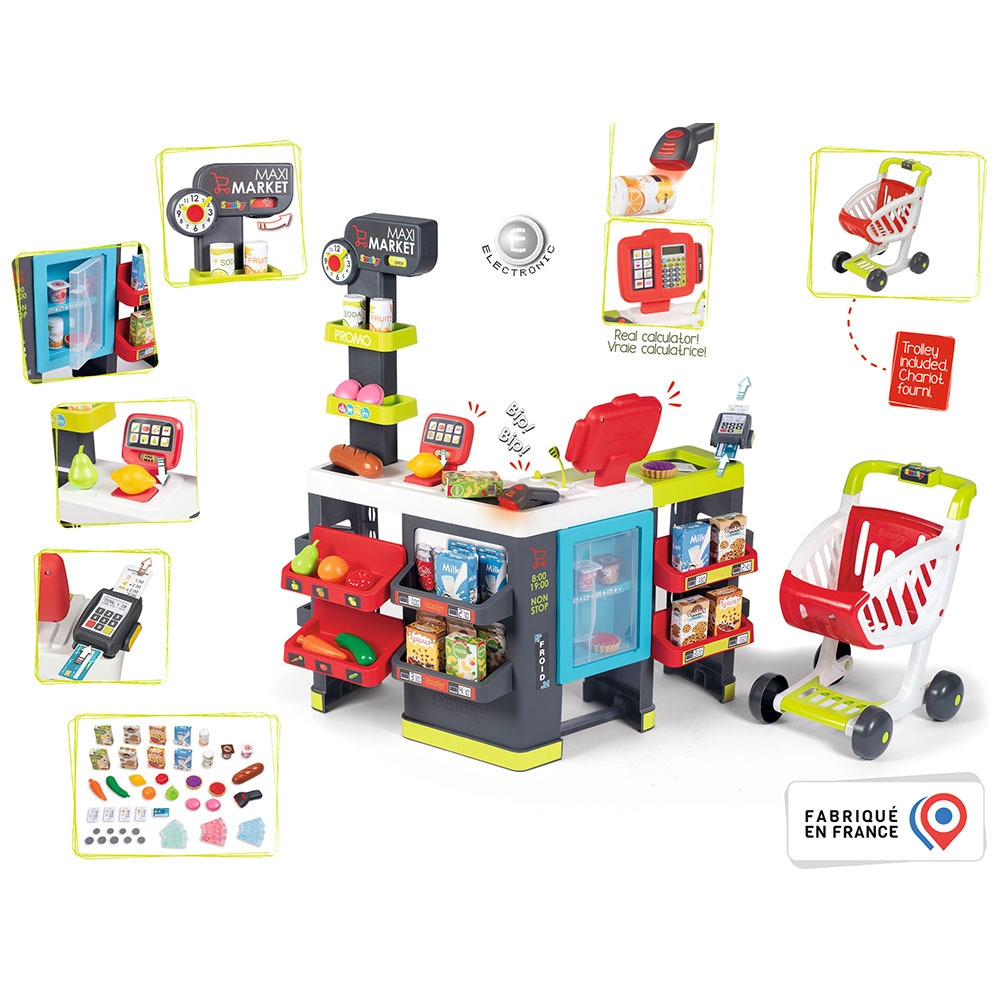 - Magazin Maxi Market cu casa de marcat electronica, cantar, frigider, carucior si 50 de accesorii ofera multa distracție, stimuleaza imaginatia copiilor si dezvolta abilitatea de a juca roluri scenarii