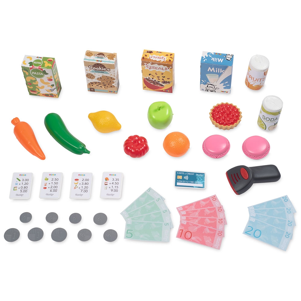 - Magazinul cu casa de marcat, cantar, carucior si 42 de accesorii stimuleaza imaginatia copiilor si dezvolta abilitatea de a juca roluri, scenarii