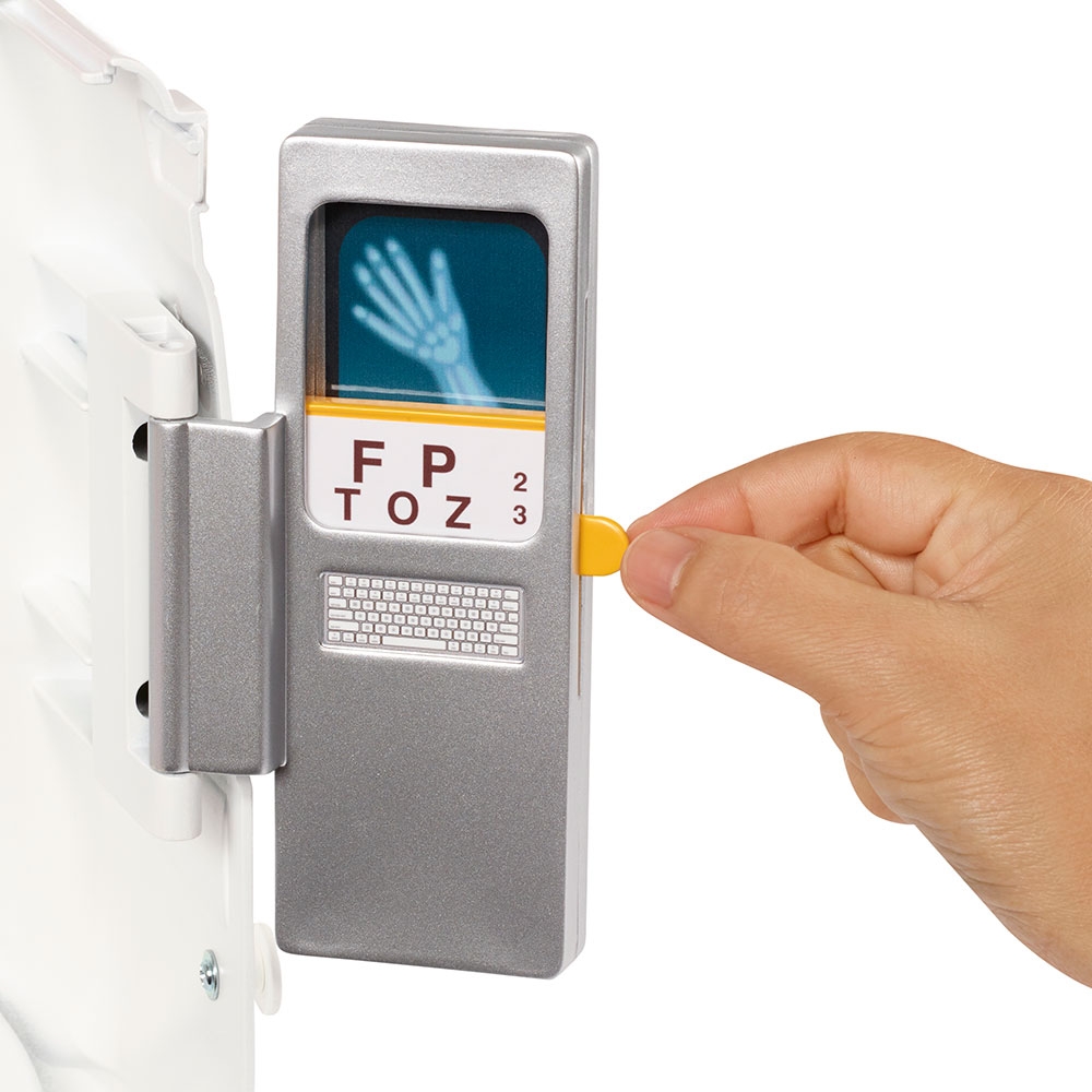 - Ambele parti se deschid pentru a dezvalui trei spatii de joaca distincte: o zona de check-in cu receptie si scaun rotativ, o sala de asteptare cu un magazin de cadouri surpriza ascuns in spatele televizorului si o sala de examinare cu echipament cu raze X care arata o diagrama de viziune, plus un pat de examinare rulant care se ajusteaza de la plat la sezut (la fel ca unul real)