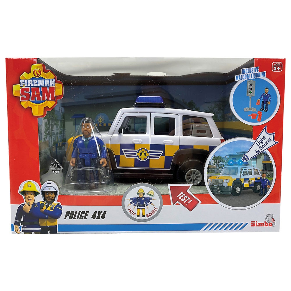 Masina de politie Simba Fireman Sam Police Car cu figurina Malcolm si accesorii
