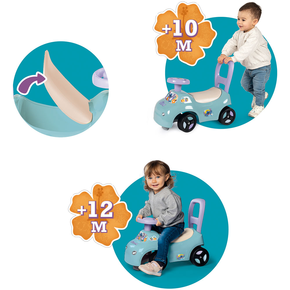 - Folosit initial ca premergator datorita manerului din spate de la varsta de 10 luni, va fi apoi folosit ca masinuta de impins pentru a explora imprejurimile de la varsta de 12 luni