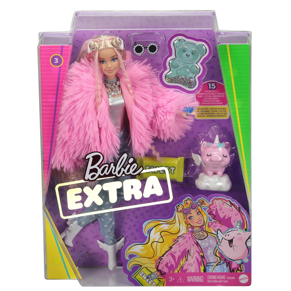 Papusa Barbie by Mattel Extra Style Fluffy Pinky GRN28 cu figurina si accesorii