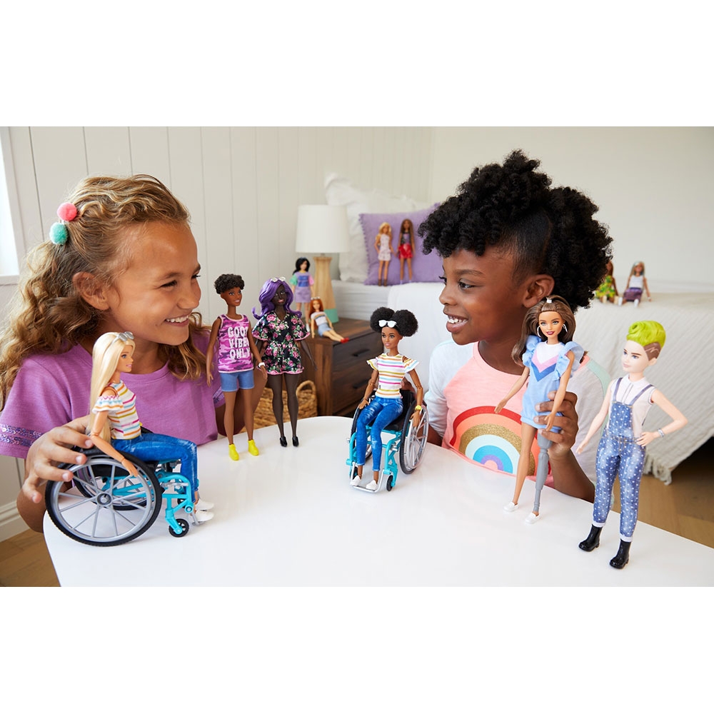 - Include papusa Barbie Fashionistas care poarta o tinuta casual, la moda si accesorii, scaun cu rotile si rampa