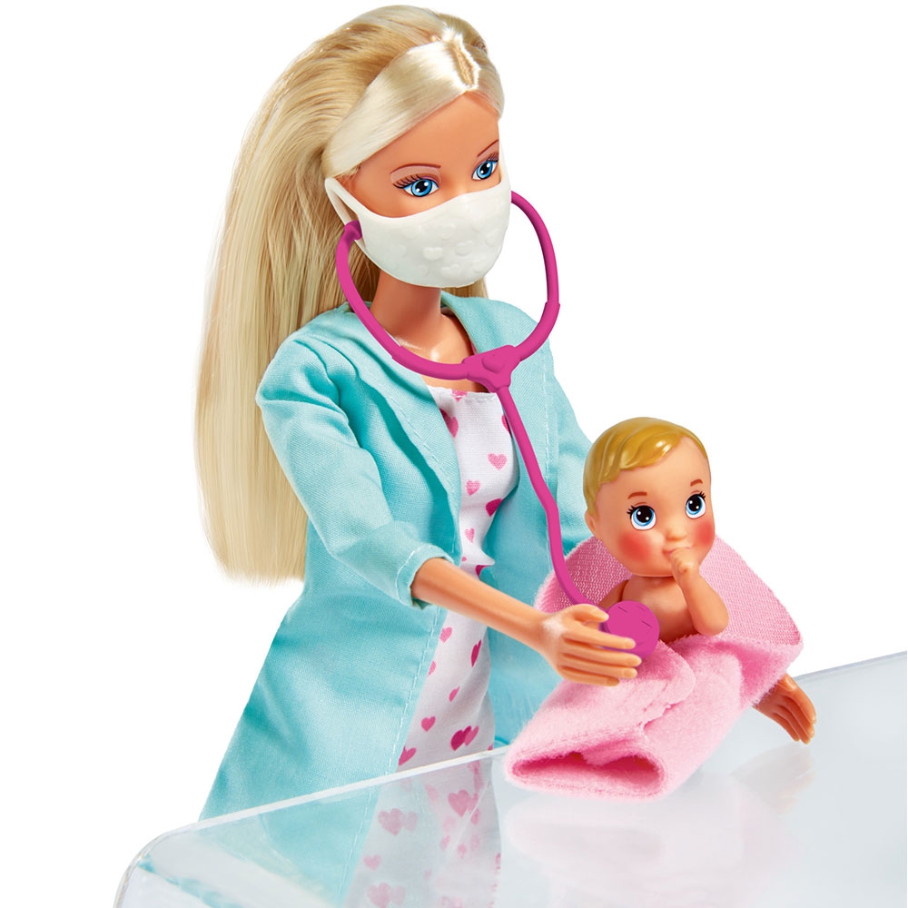 - Papusa Steffi pediatru, cu masca de fata si multe accesorii, include un bebelus cu febra