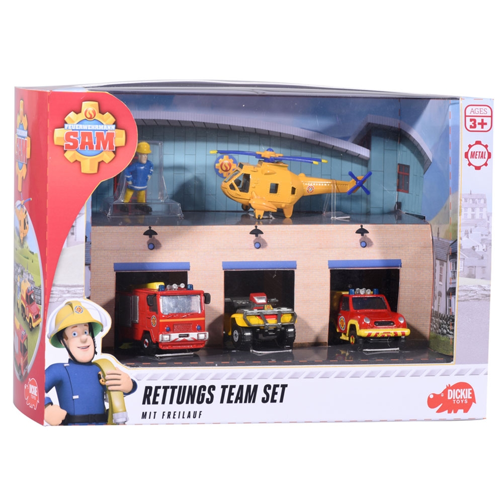 Pista de masini Dickie Toys Fireman Sam Rescue Team Sam Fire cu 3 masinute, 1 elicopter si o figurina