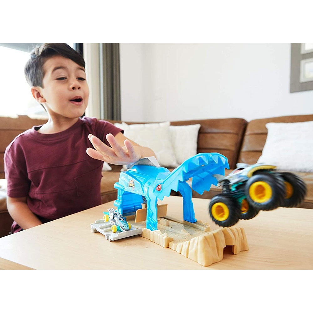 Detalii Pista de masini Hot Wheels by Mattel Monster Truck Pit and Launch Shark Wreak cu 2 masinute