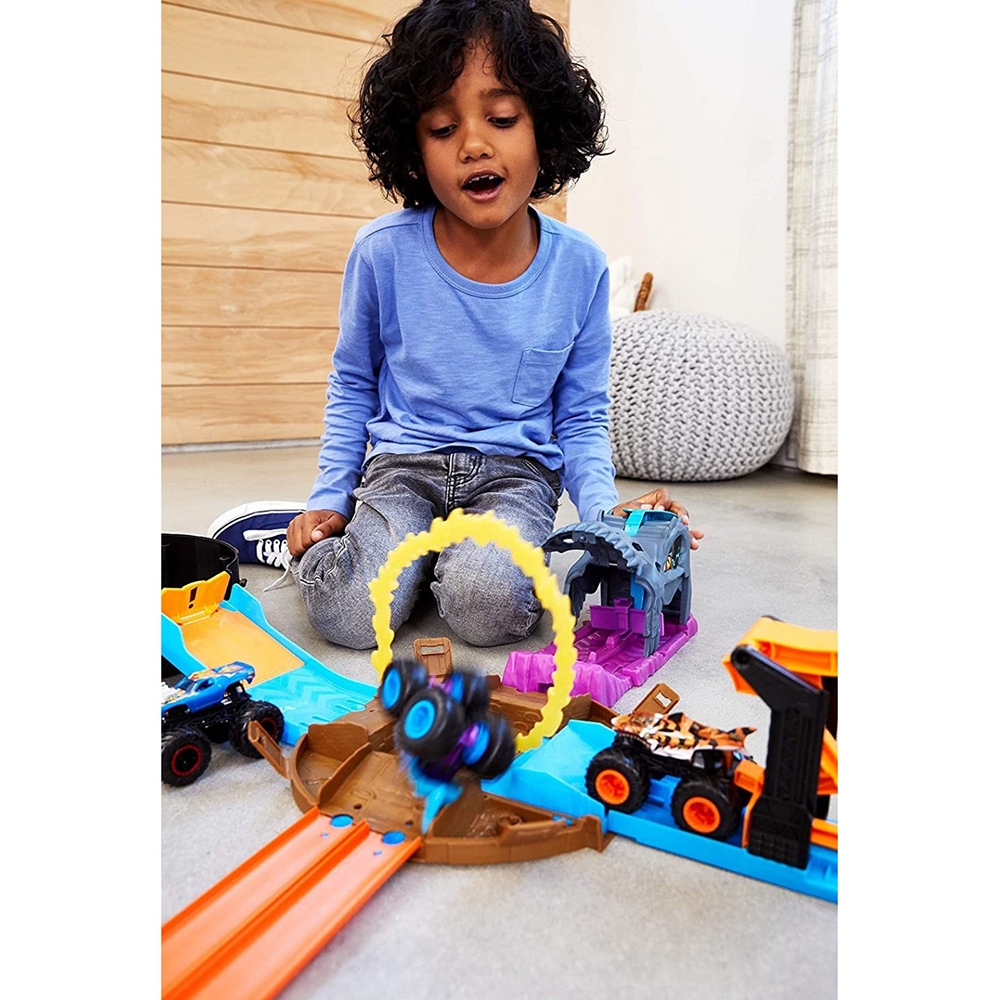 - Actiunea se amplifica cu masinile Hot Wheels si acest set cu lansator, inspirat de personajele Monster Trucks preferate de fani