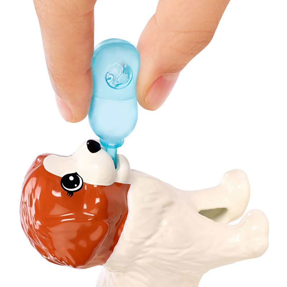 - Setul de joaca include papusa Barbie, doi catei mai mari, doi mai mici, o sticluta pentru apa, un castronel pentru mancare, trei oase, o paturica si un ziar ce isi schimba culoarea la contactul cu apa