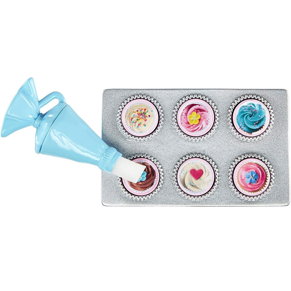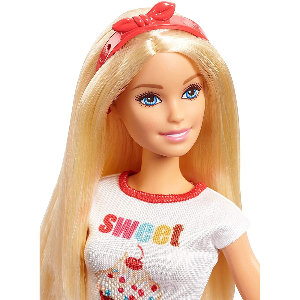 - Include o papusa Barbie, accesorii pentru bucatarie (un bol, o lingura de amestec, o cutie de prajituri, o spatula si o manusa), cuptor cu temporizator si functia de coacere, tava cu cozonac, tava cu briose si alte piese tematice