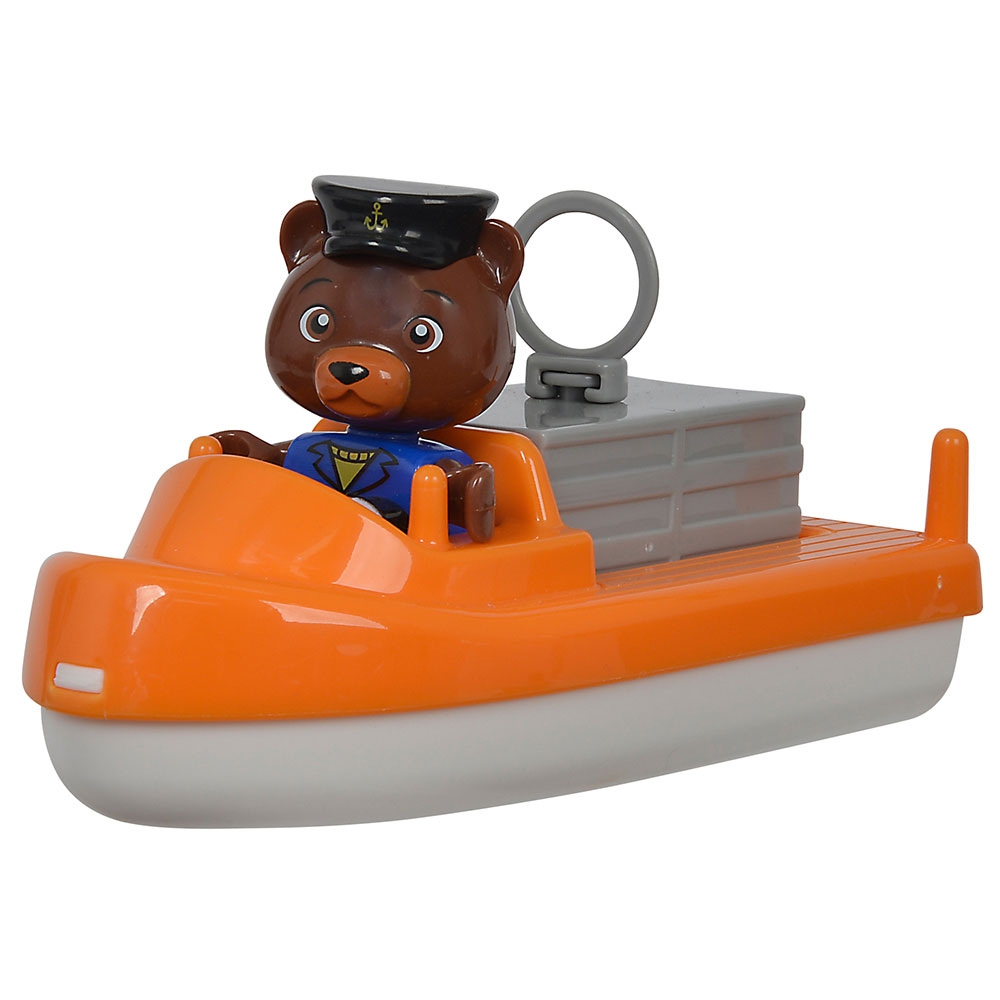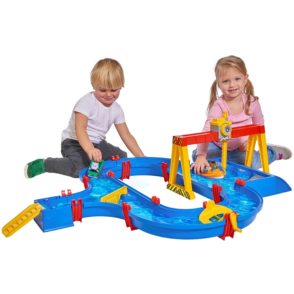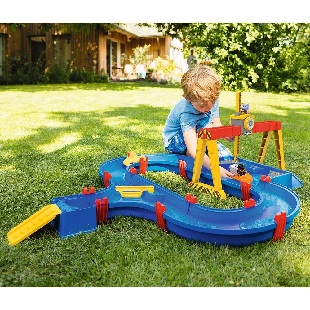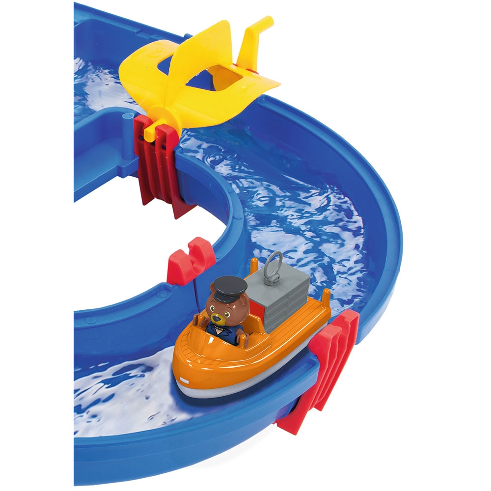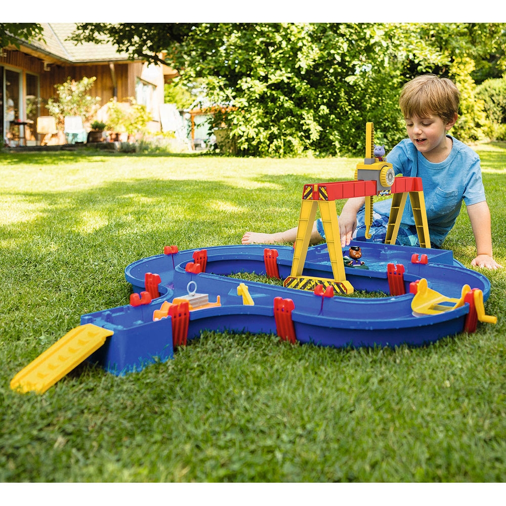 - Setul AquaPlay Container Port include un sistem de canale cu bazin portuar si o rampa de acces, o macara, o paleta de apa, o barca cu container, un vehicul amfibiu si doua figurine Bo the Bear si Wilma Hippo