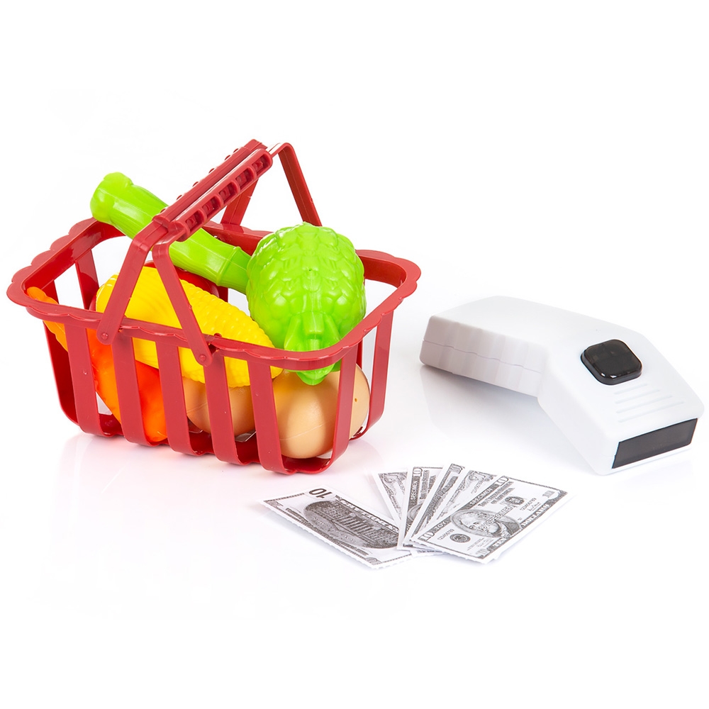 - Include 76 piese de jucarii si accesorii din diferite produse alimentare pentru cumparaturi (legume, fructe, bauturi, gustari, etc.), un mini cos de cumparaturi
