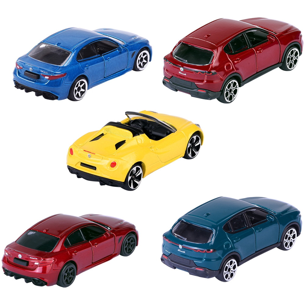 - Setul include: Alfa Romeo Giulia Quadirifoglio in rosu, Alfa Romeo Giulia Quadirifoglio in albastru, Alfa Romeo 4C Spider in galben, Alfa Romeo Tonale in verde, Alfa Romeo Tonale in rosu