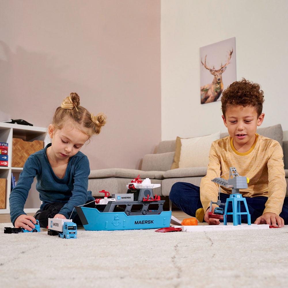 - Pe langa nava si statia portuara cu macara mobila, setul extins de joaca contine si un model de masina Maersk din metal cu licenta oficiala, un camion MAN TGX cu un container de 20 ft
