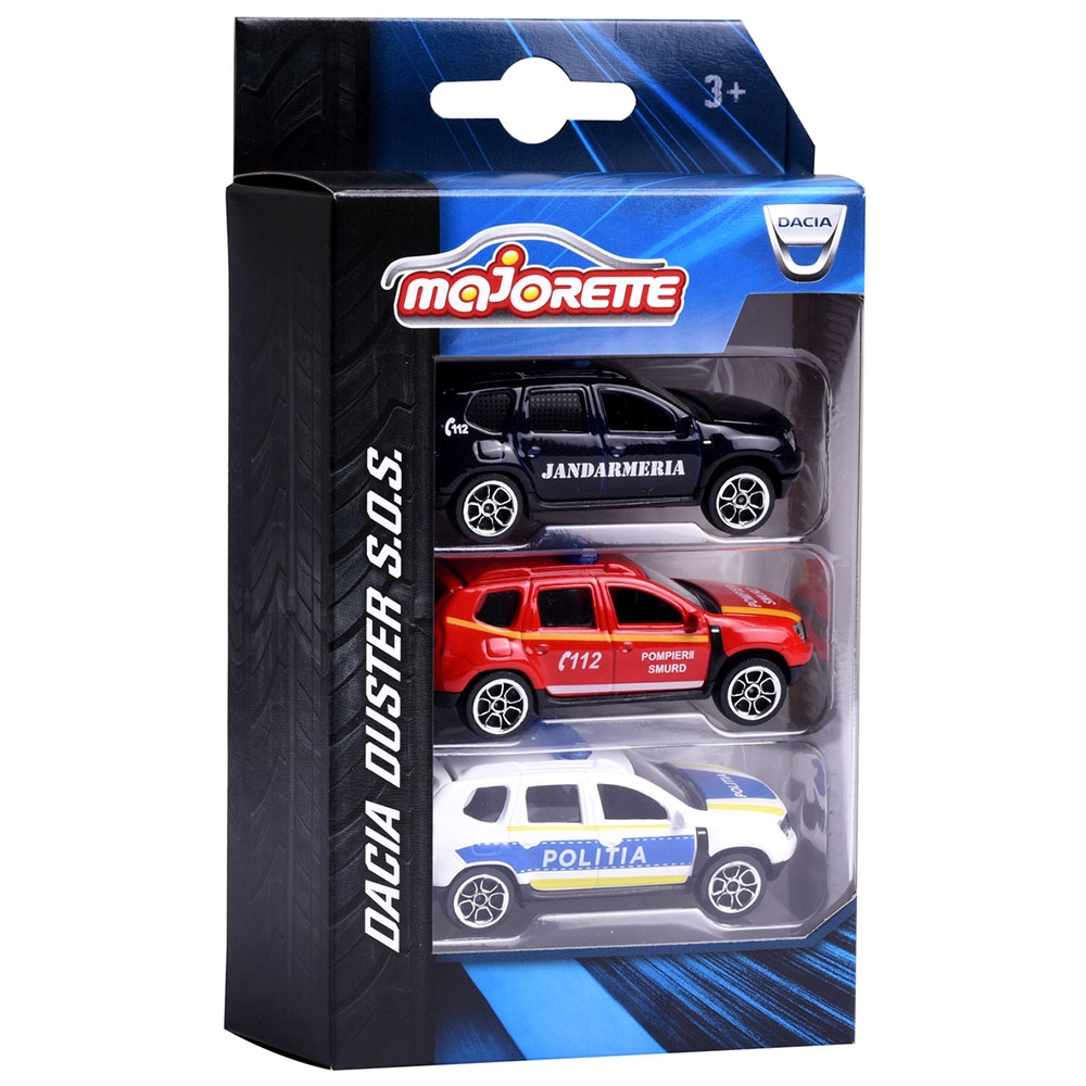 Set Majorette Dacia Duster SOS cu masina de jandarmerie, salvare si politie