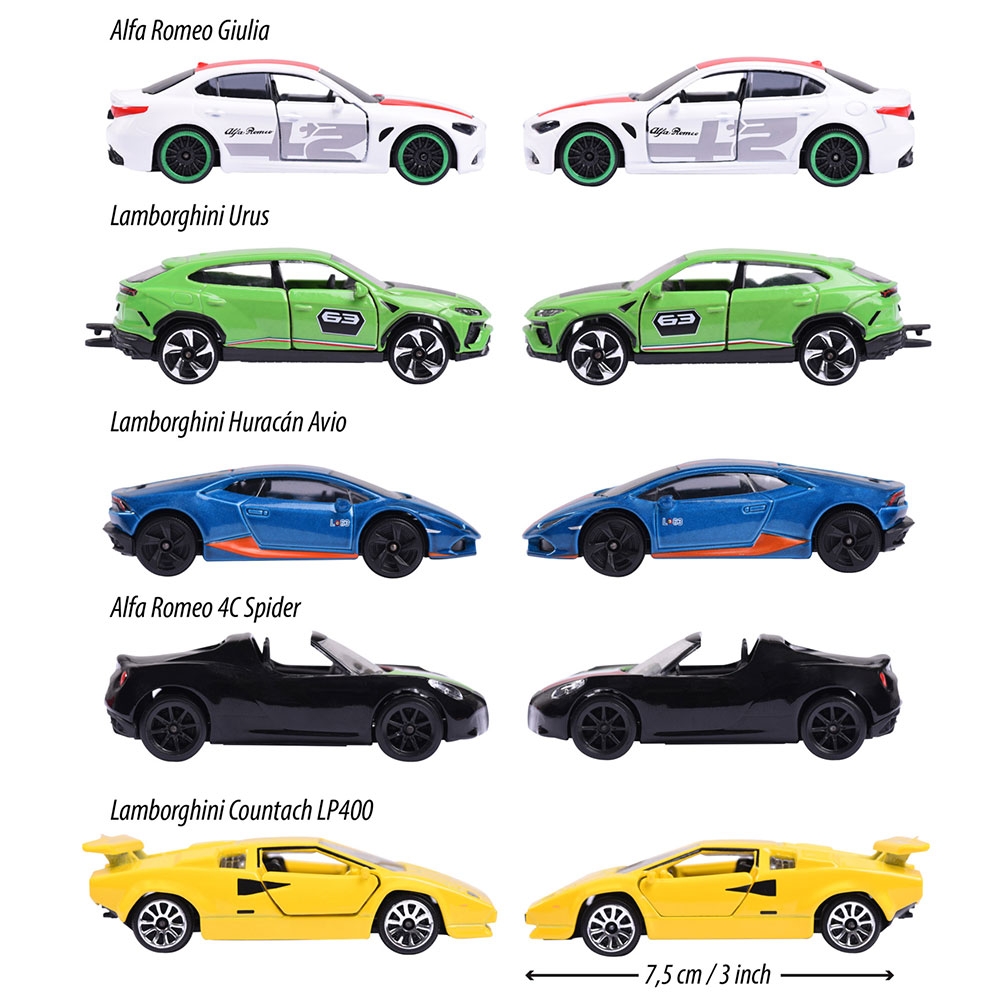 - Setul contine: 1 masinuta Alfa Romeo 4C Spider, 1 masinuta Lamborghini Countach LP 400, 1 masinuta Lamborghini Huracan Avio, 1 masinuta Lamborghini Urus si 1 masinuta Alfa Romeo Giulia