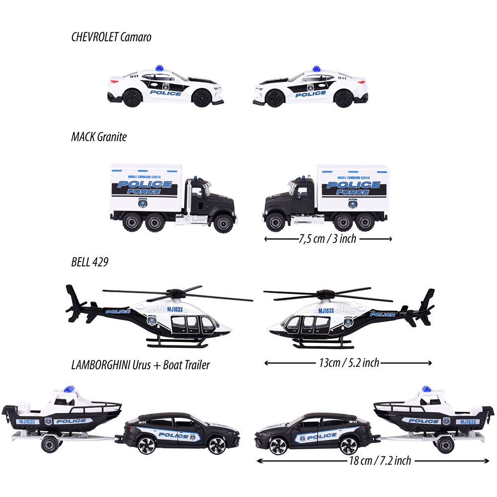 - Contine 5 vehicule: masina de politie Chevrolet, camion Mack Granite, elicopter Bell 429, masina de interventie Lamborghini Urus cu remorca si barca de politie