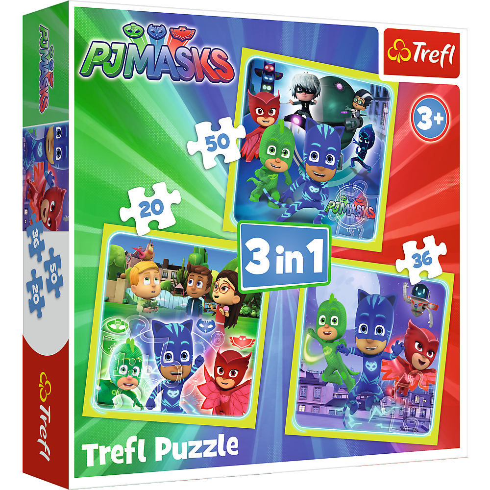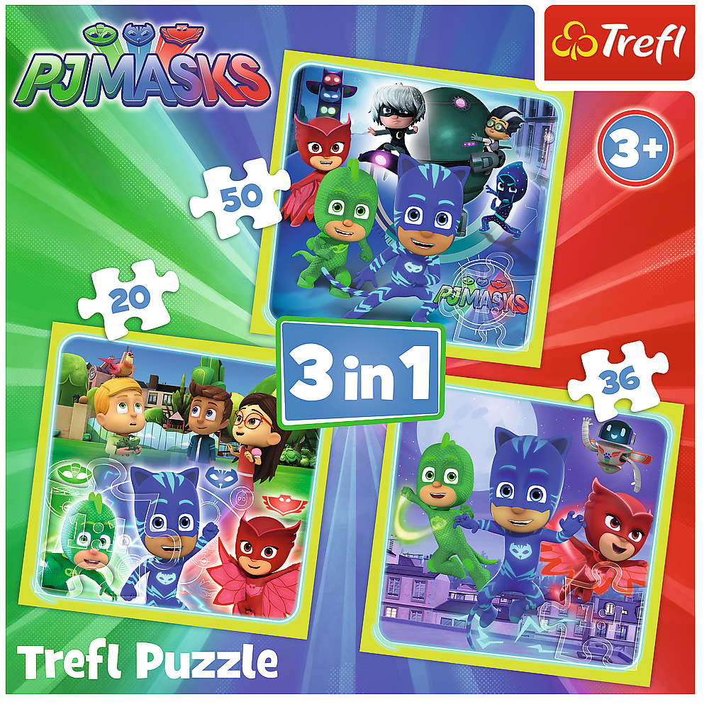 Detalii Set puzzle 3 in 1 Trefl Eroi in Pijama, Gata de actiune, 1x20 piese, 1x36 piese, 1x50 piese