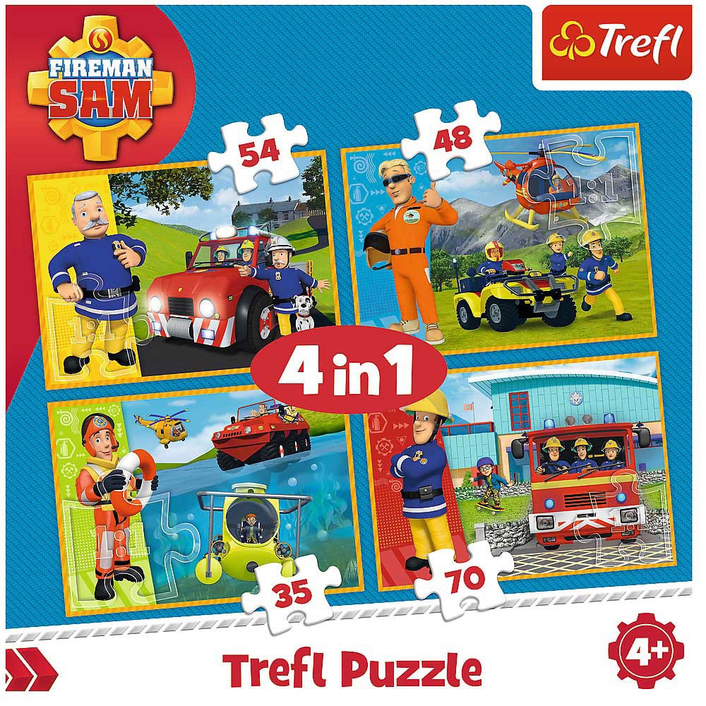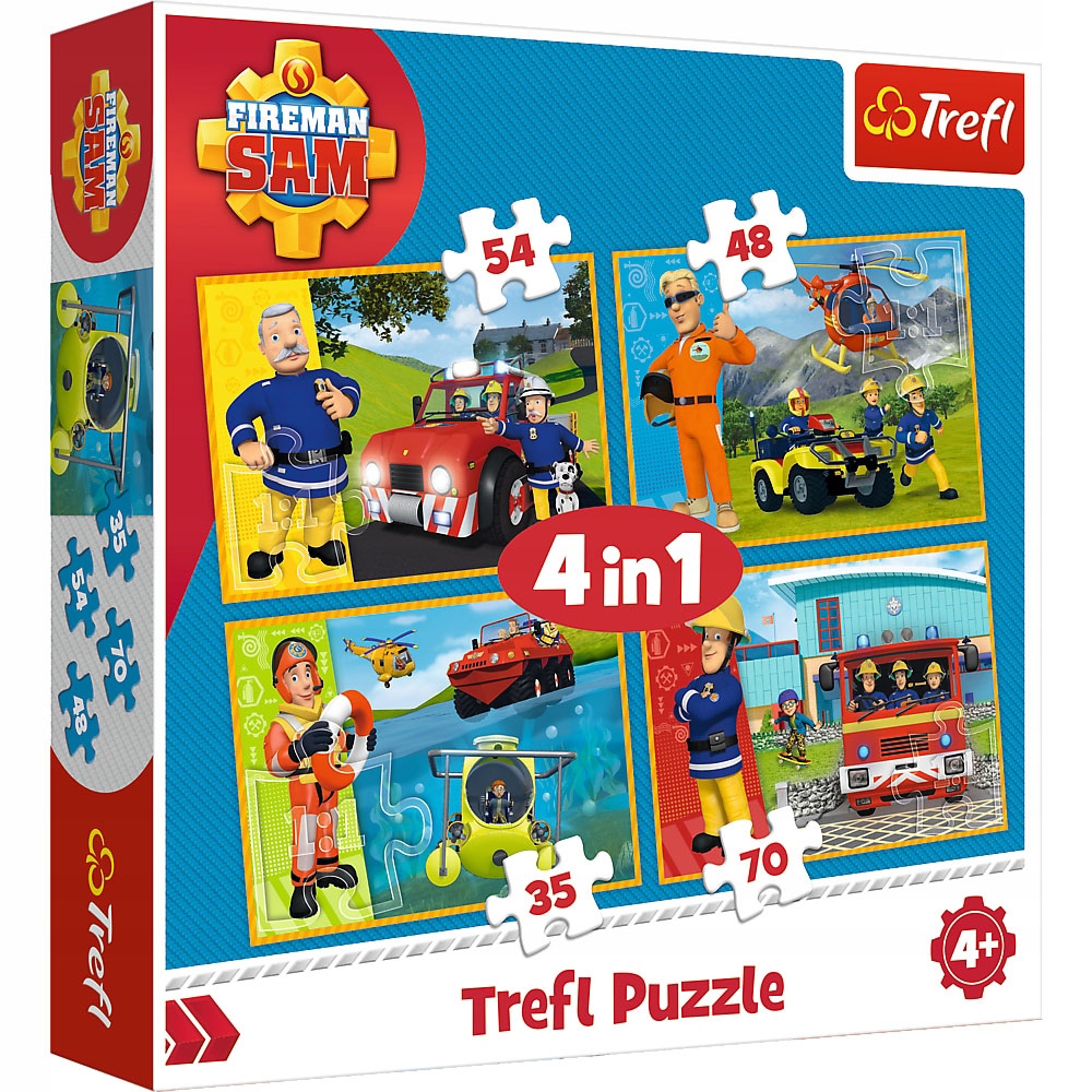 Set puzzle 4 in 1 Trefl Fireman Sam, Pompierul Sam in ajutor, 1x35 piese, 1x48 piese, 1x54 piese, 1x70 piese